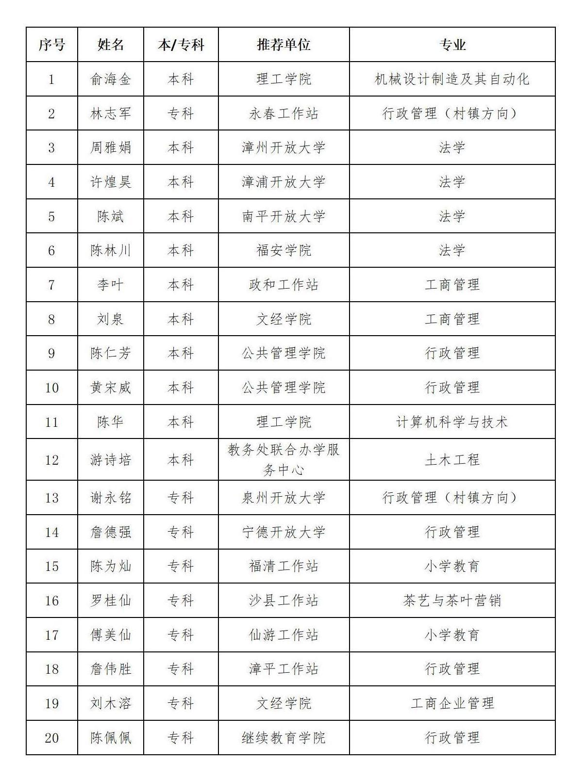 本次获评国家开放大学优秀毕业生的同学来自全省各地,有奋斗在一线的技术工人、教师、村支书、消防战士等。他们在学习上严谨认真,刻苦努力,成绩优秀,工作中爱岗敬业,勇于担当,能力突出。例如,俞海金,2019春机械设计制造专业本科毕业生,现任东南(福建)汽车工业有限公司维护技术长。他长期扎根生产一线,刻苦钻研,技艺精湛,引领技术革新、技术攻关、设备改造30余项,获得实用新型专利56项,获得“第十五届全国技术能手”“福建省五一劳动奖章”荣誉,是“省劳模工作室”“省技能大师工作室”领办人;林志军,2018秋行政管理专业专科毕业生,现任泉州市永春县外山乡云峰村委会主任。短短3年,他以退伍军人不变的本色和作风,带领家乡走上脱贫致富的道路,实现从“贫困村”到“富裕村”的完美转变,获第七届福建省道德模范荣誉称号。