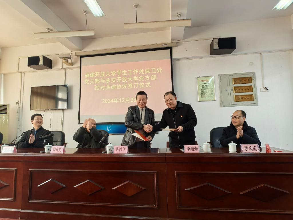活动由永安开放大学校长钟育炎主持。他代表永安开放大学党支部介绍了永安开放大学的基本情况、特色做法以及党建工作的经验,学生工作处保卫处党支部书记张以华代表学生工作处保卫处党支部介绍了支部的基本情况以及此次共建的目的意义,指出此次党建共建成为双方携手推动学生工作以及党建工作的重要纽带。随后学生工作处保卫处党支部与永安开放大学党支部举行共建签约。