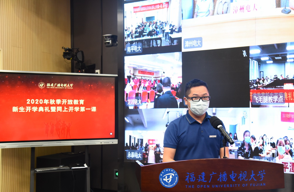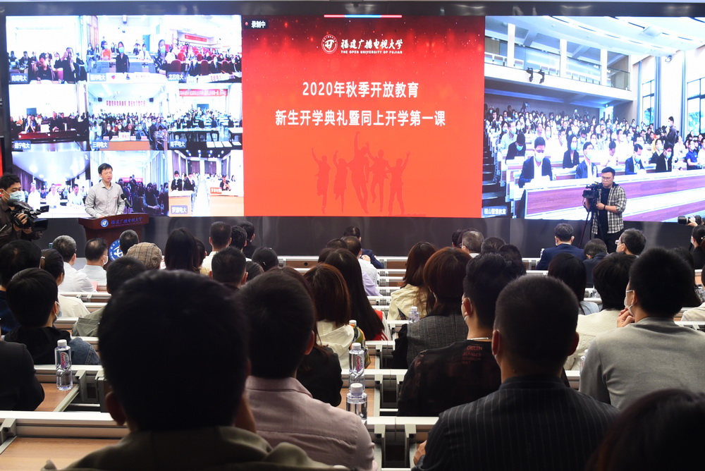 省电大党委书记陈兴炎,党委副书记、校长吴国荣,党委副书记马成斌、纪委书记王幼新、副校长李正光及各地电大领导和师生代表近3000人在主、分会场参加活动。2020年秋季共招收16230人,未到现场新生通过网络直播参加开学式,八闽万生齐聚“云端”,同上开学第一课。马成斌主持开学典礼。