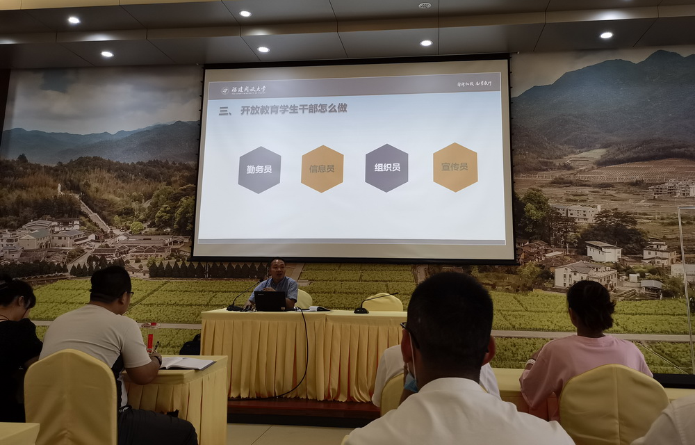 在学生工作能力培训环节,学生工作处处长应木荣以《深入学习党史校史当好开大学生干部》为题,介绍了开放大学的发展历史和特点,分析了广播电视大学的作用和意义,介绍了新时期党和政府赋予开放大学的使命和任务,号召学员了解母校、增强自豪感与上进心,争当修身立德、勤学笃行、敬业实干,具有开放大学特点的学生干部,在岗位上争取出色的业绩。具有近二十年班主任工作经验的理工学院科长章学珠为大家带来《当好“四员”角色 做一名有信念、有担当、有情怀的学生干部》的专题辅导,指出开放教育学生干部的重要性,强调学生干部要当好勤务员、信息员、组织员、和宣传员,并结合具体实例告诉大家学生干部要做什么、怎么做。