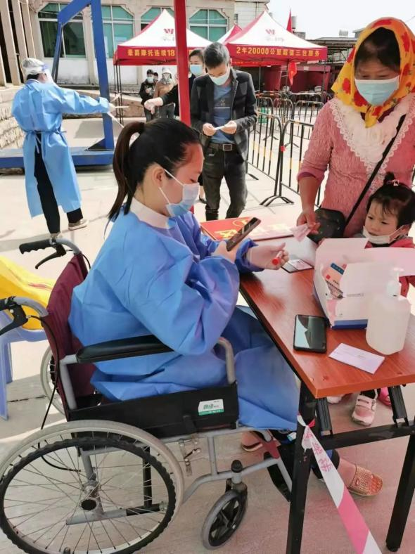 陈雅洪是22春台商行政管理专科班的一名新生。2月18号在张坂核酸检测点值班回来的路上因意外导致脚骨折。但面对本次疫情其村需要大规模核酸检测的情况下,她坐着轮椅上了“战场”。她说:“怕人手不够就去了,想着能出一份力也好。”
