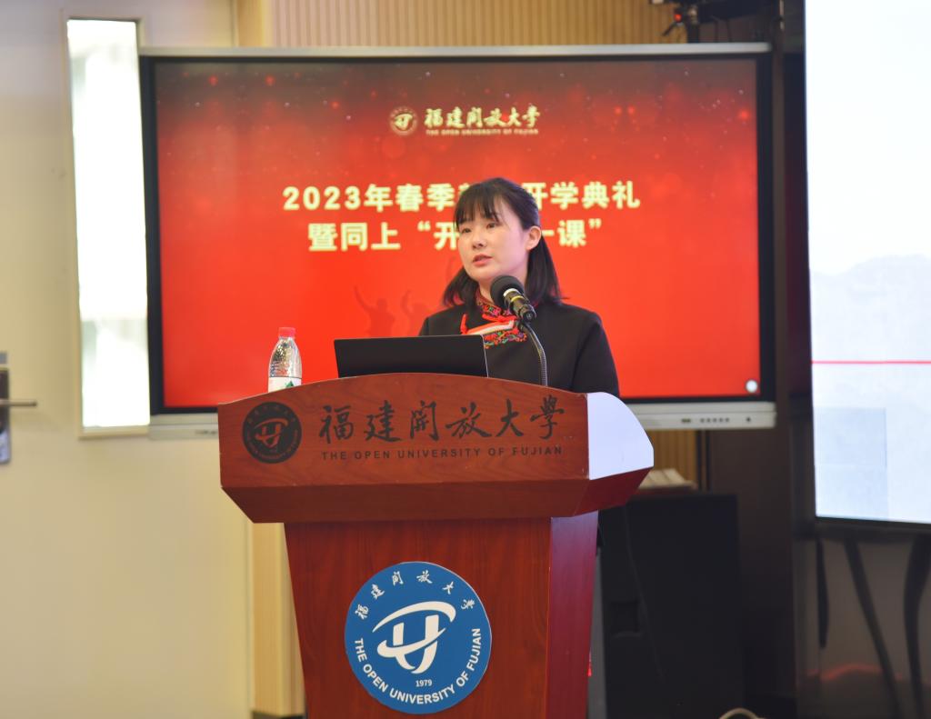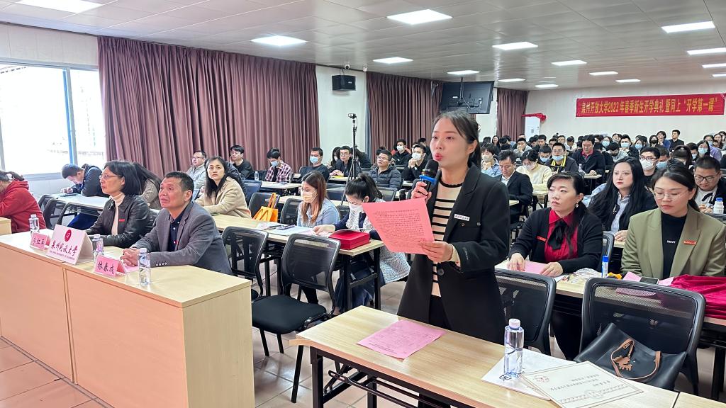 开学典礼在嘹亮雄壮的国歌声中开始。典礼表彰了国家开放大学奖学金和优秀学生干部获得者,校领导为获奖代表颁发了荣誉证书。泉州开放大学小学教育本科专业黄萍萍同学代表在校生、奖学金获得者在泉州分会场发言,文经学院书法学本科专业林珍平同学代表新生在主会场发言。他们从不同角度分享了自己参加福建开放大学学习的认识、经历和体会。国家开放大学师德标兵、公共管理学院副教授王小红代表教师发言,从教师角度给同学们分享了三点学习心得。校领导为新生代表佩带了校徽,新生进行了入学宣誓。