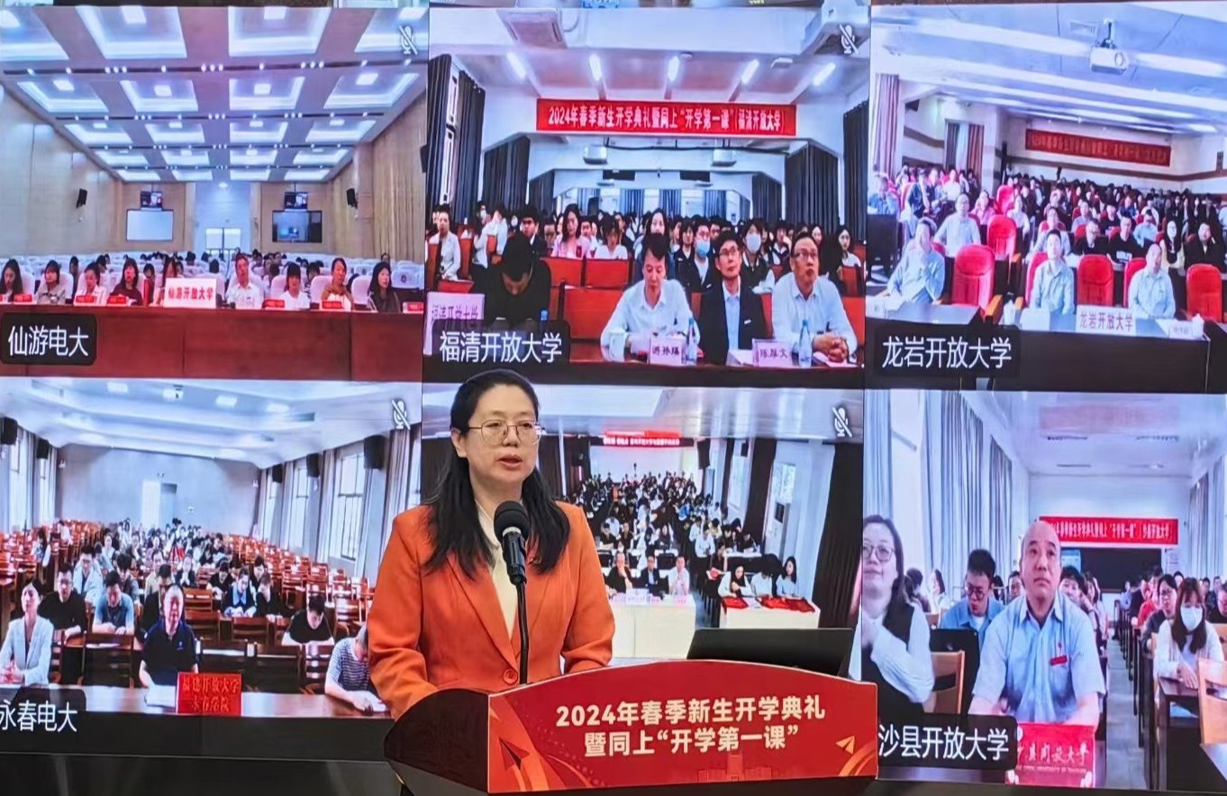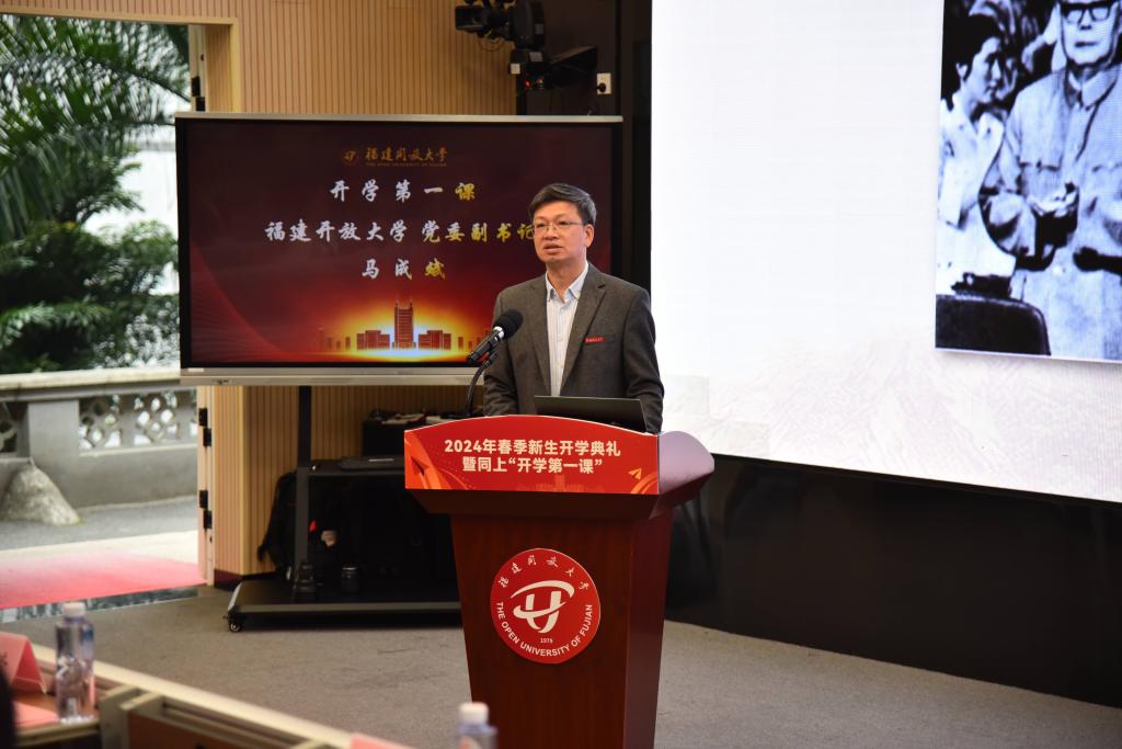 党委副书记马成斌围绕“追梦不止步 奋斗正当时”这一主题为全体新生开讲入学第一课。他首先欢迎14700多名来自八闽大地的学子加入“开放大学”这个大家庭,并围绕“走进开大历史”“见证开大发展”“传承开大精神”3个方面介绍了学校的发展历程与办学成果。他指出,学校是邓小平同志亲自倡导并批准成立的,是全国首批设立的28家广播电视大学之一,伴随中国改革开放历程成长壮大。1999年10月时任福建省省长的习近平总书记向学校20周年校庆发来贺信,2000年11月又到校调研指导工作,这是学校光荣的办学历史和独特的精神财富。建校45年以来,学校始终牢记育人使命,立足自身特色优势,书写了融合开大、多元开大、数字开大、开大榜样的精彩篇章。他例举了林玉登、洪树棠、林长宣、陈晓冬、邓仰清等遍布八闽大地的各行各业的优秀校友,激励同学们成为想为、敢为、善为的新时代人才。最后,他用“自强弘毅、励学敦行”的校训精神对各位新生提出了殷切期望,希望同学们在求学路上要立“自强”之志,坚定理想信念;要怀“弘毅”之心,锤炼道德品行;要兴“励学”之风,坚持勤思善悟;要聚“敦行”之力,做到唯实唯新。希望同学们志存高远、脚踏实地,珍惜学习机会,开创人生的无限精彩!
