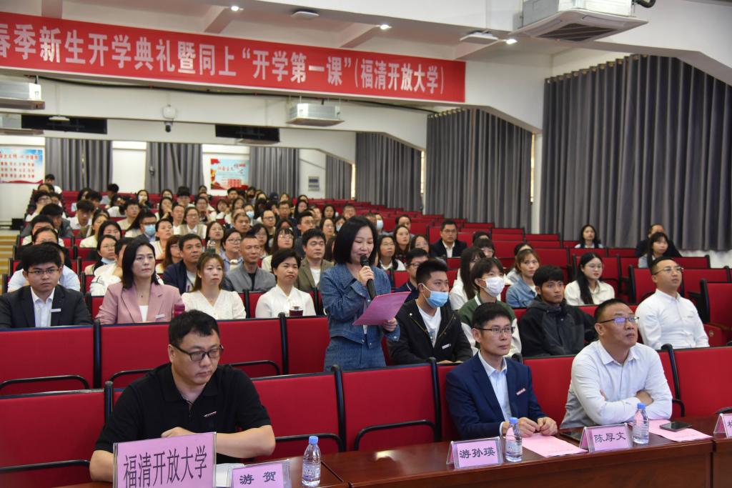 开学典礼在嘹亮雄壮的国歌声中拉开帷幕。典礼表彰了2023年度福建开放大学优秀毕业生和第九届 “互联网+”大学生创新创业大赛获奖项目。校领导分别为获奖代表颁发了荣誉证书和奖牌。福清开放大学2021春季法学本科专业林静同学代表在校生在福清分会场发言,公共管理学院2024春季行政管理本科专业邱夏燕同学代表新生在主会场发言。他们结合自身的工作经历分享了自己参加福建开放大学学习的成长和收获,表达了珍惜学习机会、脚踏实地学习的决心。理工学院刘海英教授代表教师发言,用“三心”对全体新同学提出三点希望,并代表全体教师作出承诺。