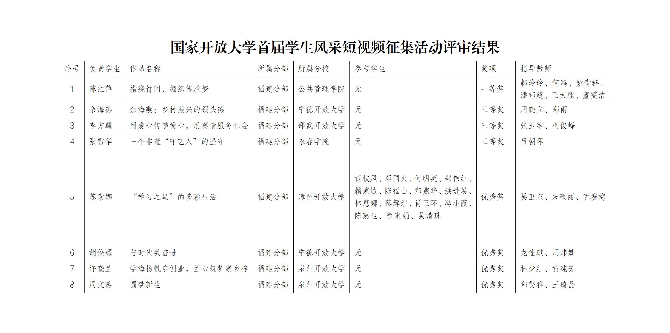 其中,我校公共管理学院作品《指绕竹间,编织传承梦》获一等奖,宁德开放大学作品《余海燕:乡村振兴的领头燕》、邵武开放大学《用爱心传递爱心,用真情服务社会》、福建开放大学永春学院《一个非遗“守艺人”的坚守》获三等奖,多项作品获优秀奖。