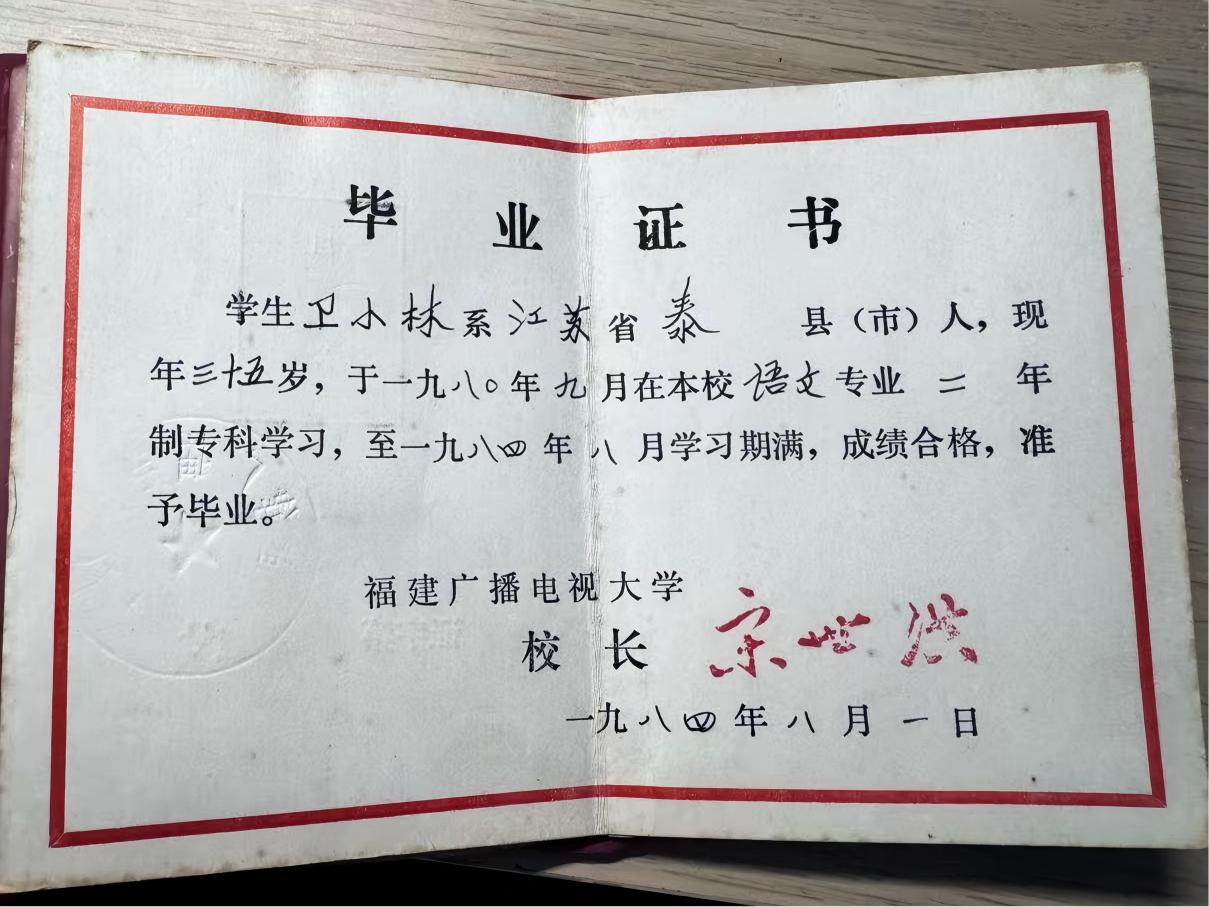 1980年,改革开放的春潮涌动。那年秋天,卫小林在福建广播电视大学(福建开放大学前身)简陋的教室里,开启了新的求学路。作为“被耽误”的一代人,福建广播电视大学招收(普通大学)超龄考生,无疑就像一把追回光阴的钥匙。当时,她是建宁县文工团一名乐手,无法按时到校上课。“每学期开学到校注册、领教材,在老师同学帮助下自学,期末回福州考试”,她回忆道“中文专业的学习,不仅锤炼了扎实的文字功底和逻辑思维,更养成了我终身受益的自学习惯与时间管理能力”。跋涉山乡间的演出路上、练琴和排演的间隙、演出结束大家入眠之后……见缝插针式地学习,却扎扎实实。1983年,福建电视台从电大中文直属班借调新闻编辑,在班主任郝鸣老师举荐下,卫小林以优秀的成绩和一篇高分作文被选用,一年后正式调入福建电视台,进入电视新闻行业。她说,“是电大给了我一把改变人生轨迹的钥匙。”
